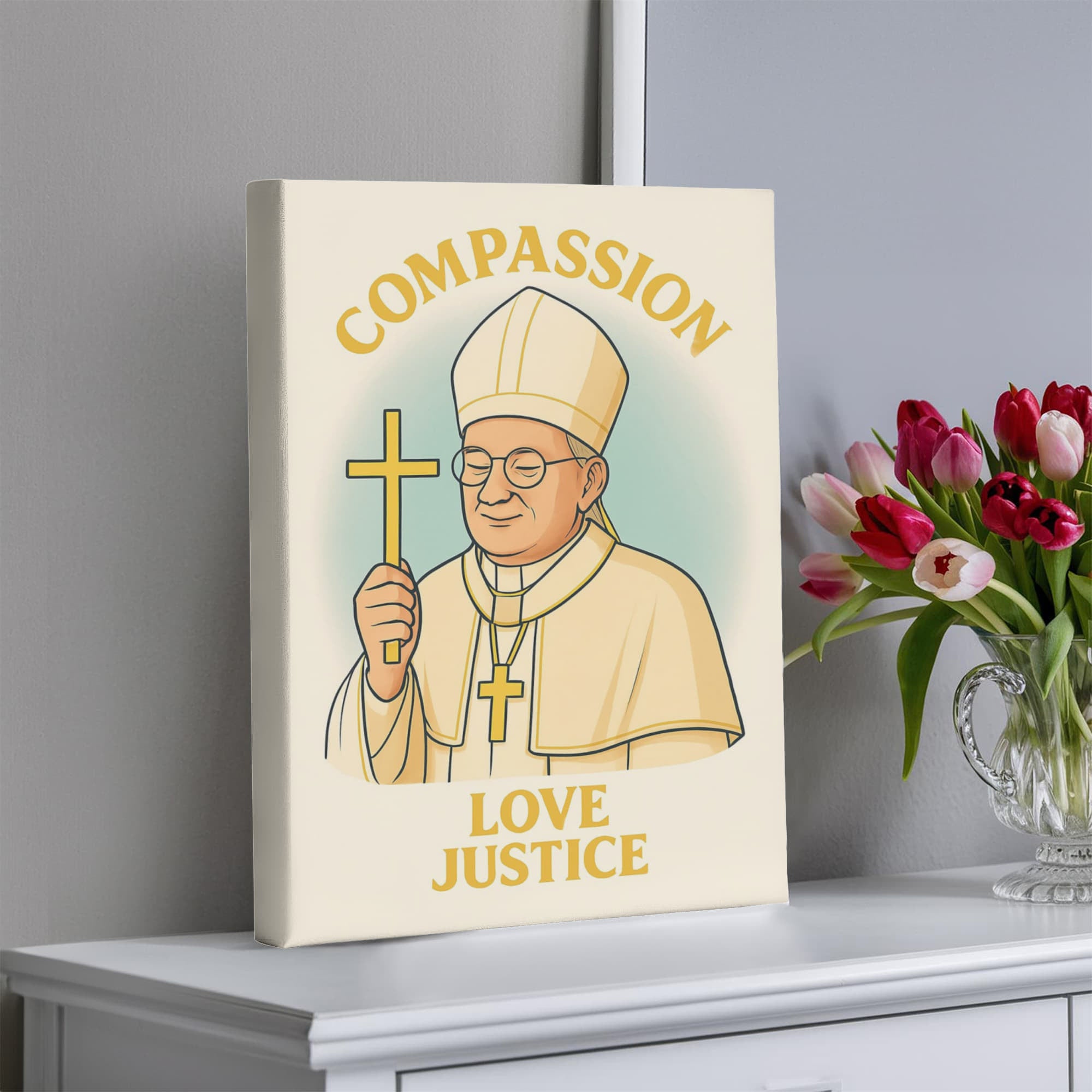 Celebrate Pope Leo's election as Catholic Pope with this Compassion Love Justice Canvas Wall art Print. We need compassion, love, justice, faith, hope and charity. Help share this message in your home or as a gift.